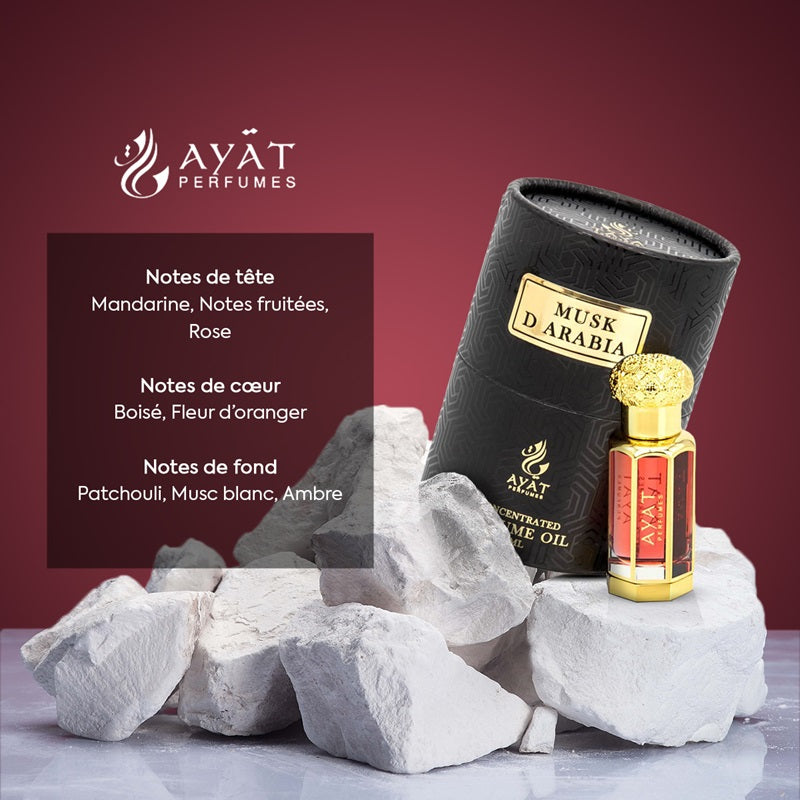The base notes of Musk d'Arabia unveil a trio of patchouli, white musk, and amber, anchoring the fragrance with a rich and sensual depth. Patchouli brings its earthy and slightly spicy nuances, enriching the scent with an intriguing complexity. White musk offers a touch of cleanliness and softness, creating a soothing contrast with the vigor of patchouli. Amber, meanwhile, envelops the composition in a warm, resinous halo, adding a touch of luxury and a lingering trail.